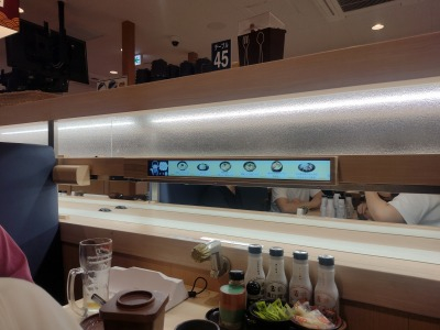 今はタッチパネルで注文が主流になっていますが、ここでは回転するところの上にもモニターがあり、画面内でお寿司が流れていました!
