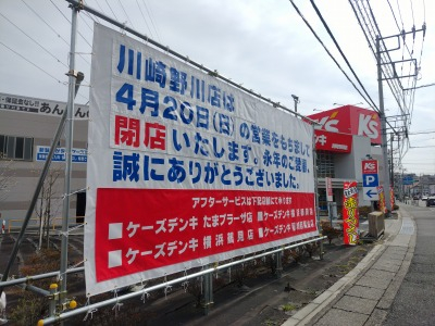 ケーズデンキ川崎野川店が4月20日をもって閉店するそうです。