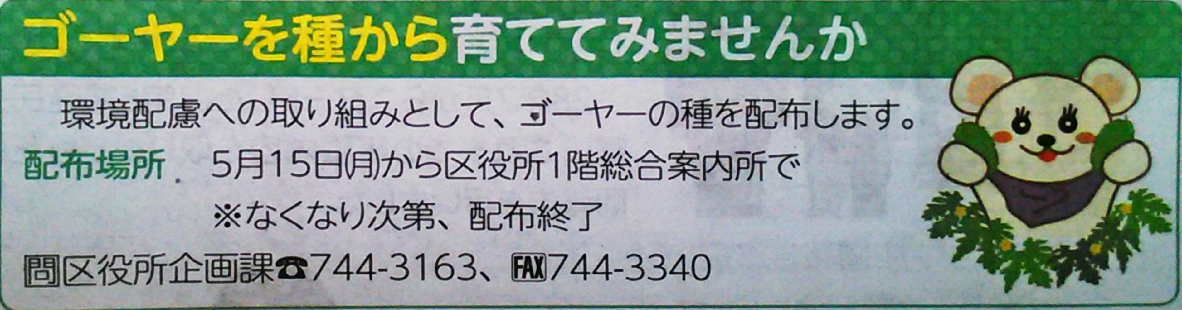 明日5月15日(月)中原区役所1階でゴーヤの種を配るそうです。
