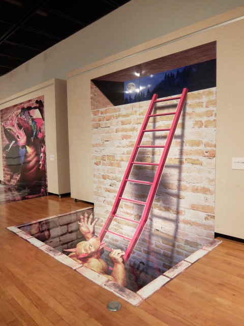 特に楽しかったのが「だまし絵」で、壁と床に平面的に絵が描かれているだけなのに、指定された角度から写真を撮ると立体的に見えるようになっています。