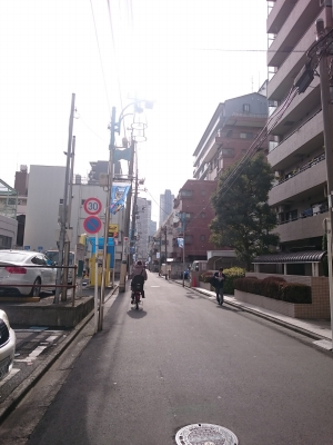 駅の裏の自動車がちょうどすれ違いできる幅の道で