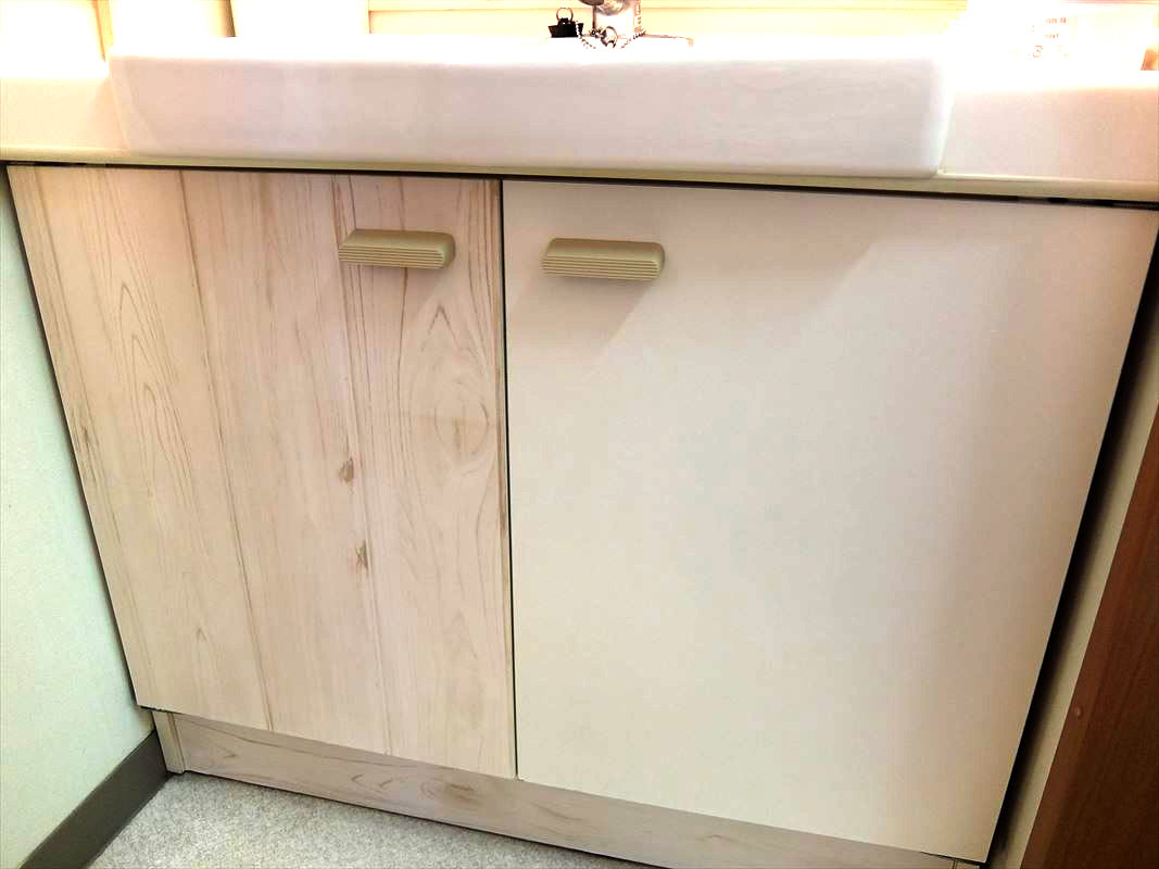 洗面台の収納扉に100均のリメイクシートを貼りました。