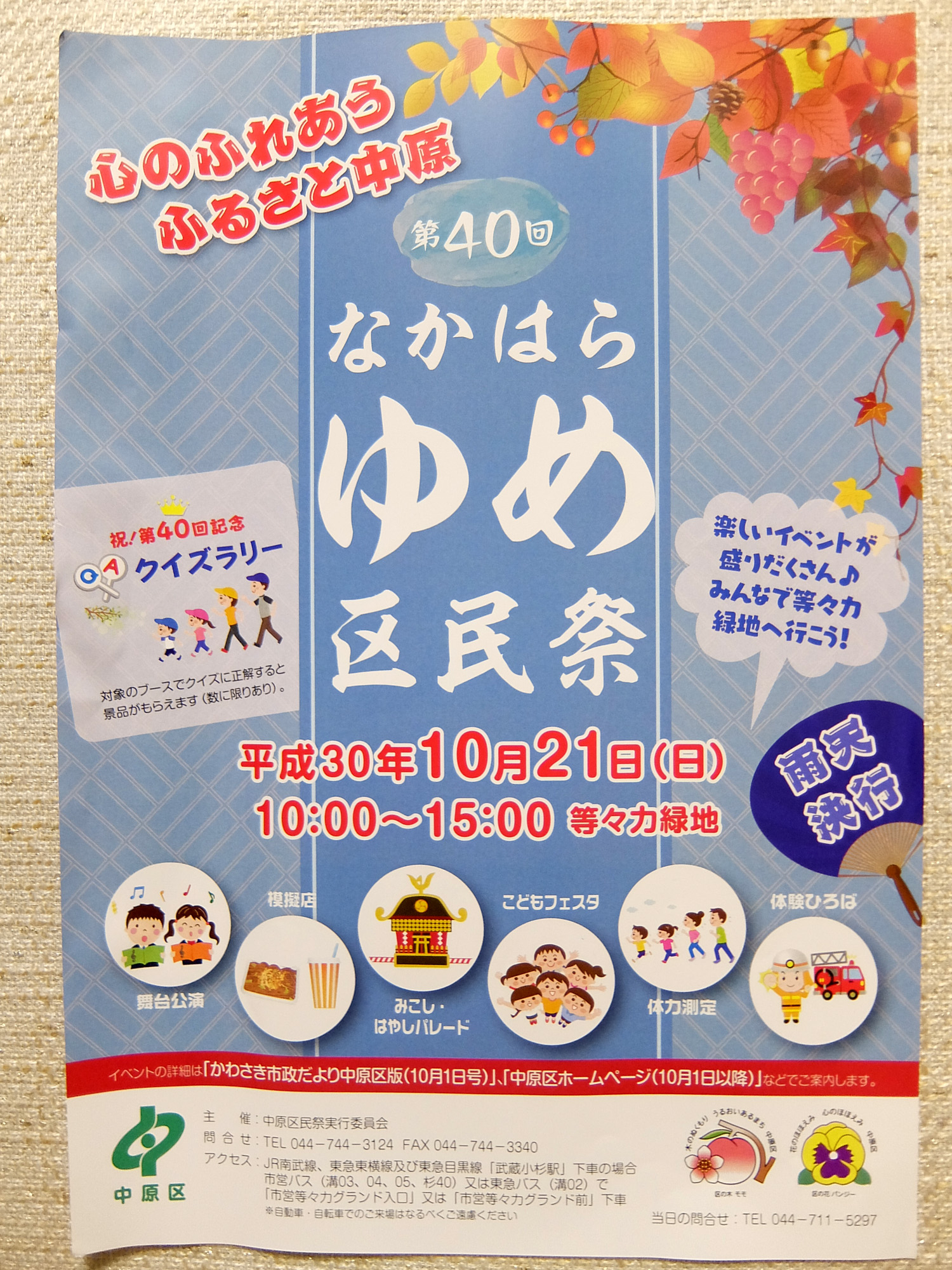 明日、10月21日(日)は等々力緑地で第40回なかはらゆめ区民祭が行われます。