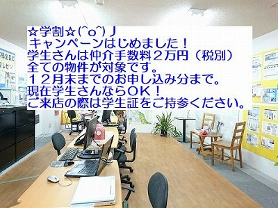 学生さんは仲介手数料2万円(税別)!