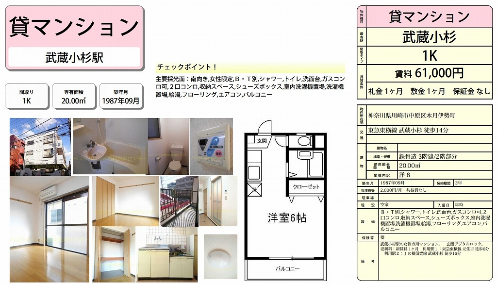 ☆武蔵小杉駅徒歩14分。元住吉駅徒歩6分。
