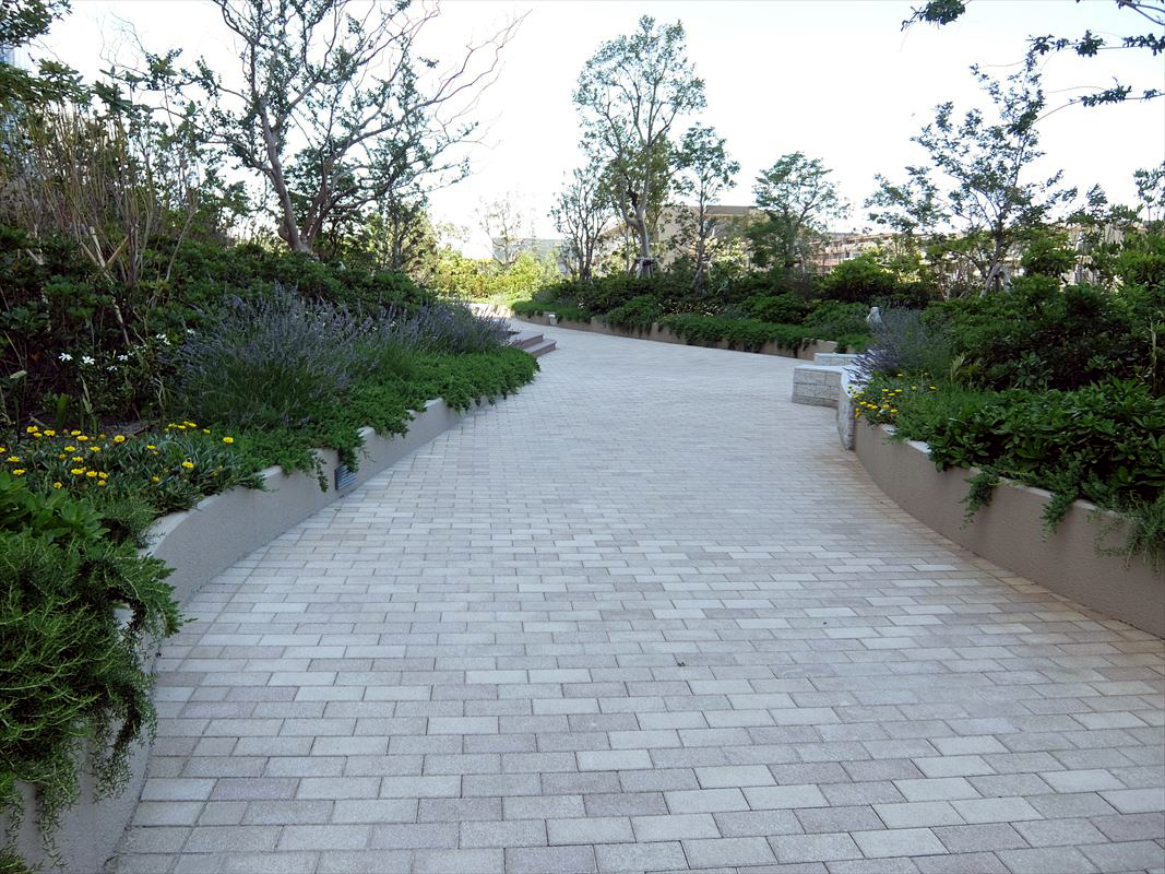 新しくできたタワーマンションの外周、二階部分に自由にくつろげるスペースがあります。
