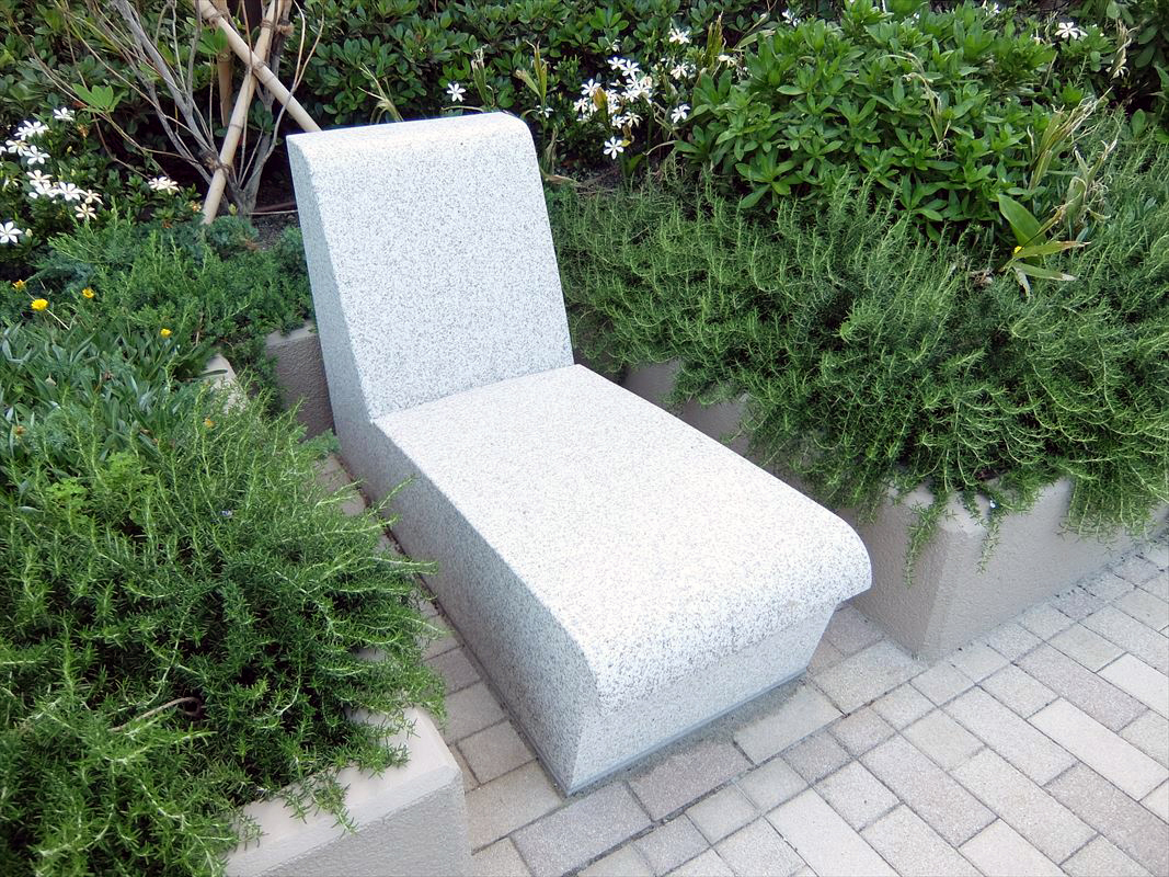 タワーマンションの外周、二階部分のくつろぎスペースには、石でできた椅子のようなものが点在しています。