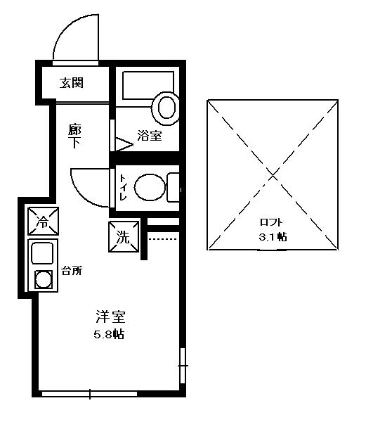 お部屋は2階部分。洋室5.8帖にロフト3.1帖付き。