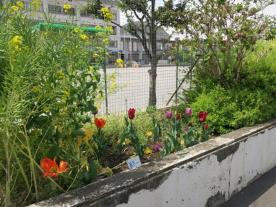 今井中学校の学校周りにスペースがあり、四季折々花が植えられています。